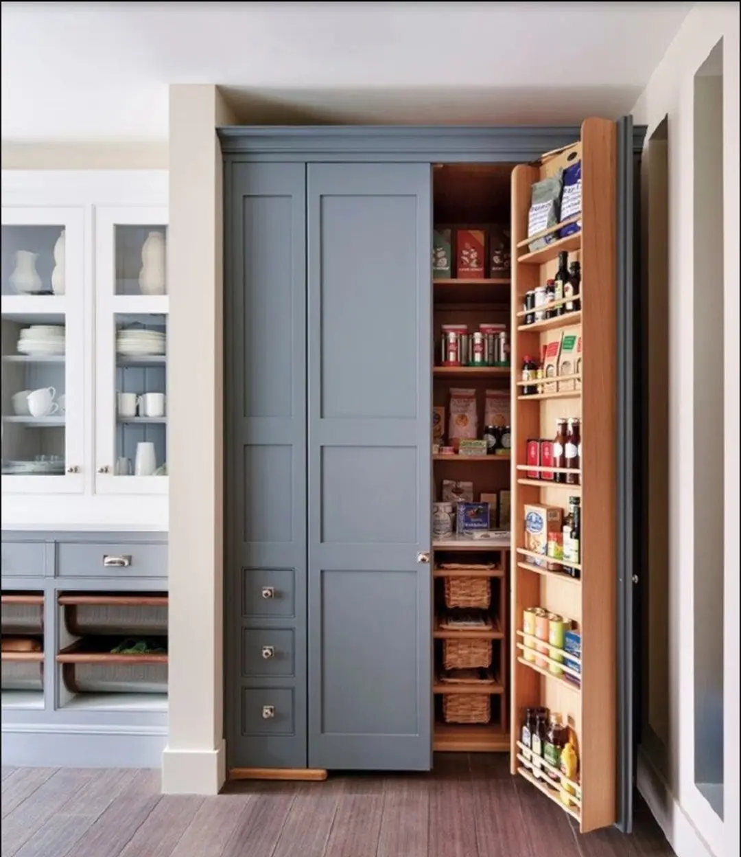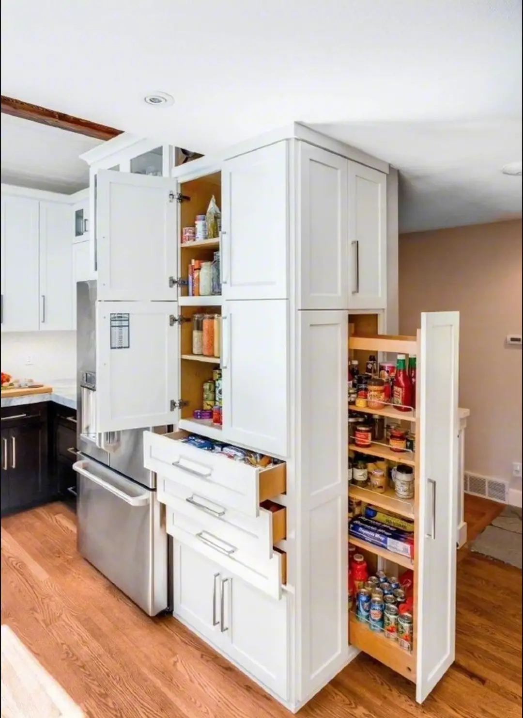 一些并不需要冰箱冷冻保鲜的食材,可以分类设计成不同的储物柜进行收藏,这些隐藏的柜子,真是越看越实用,越看越美观呢!