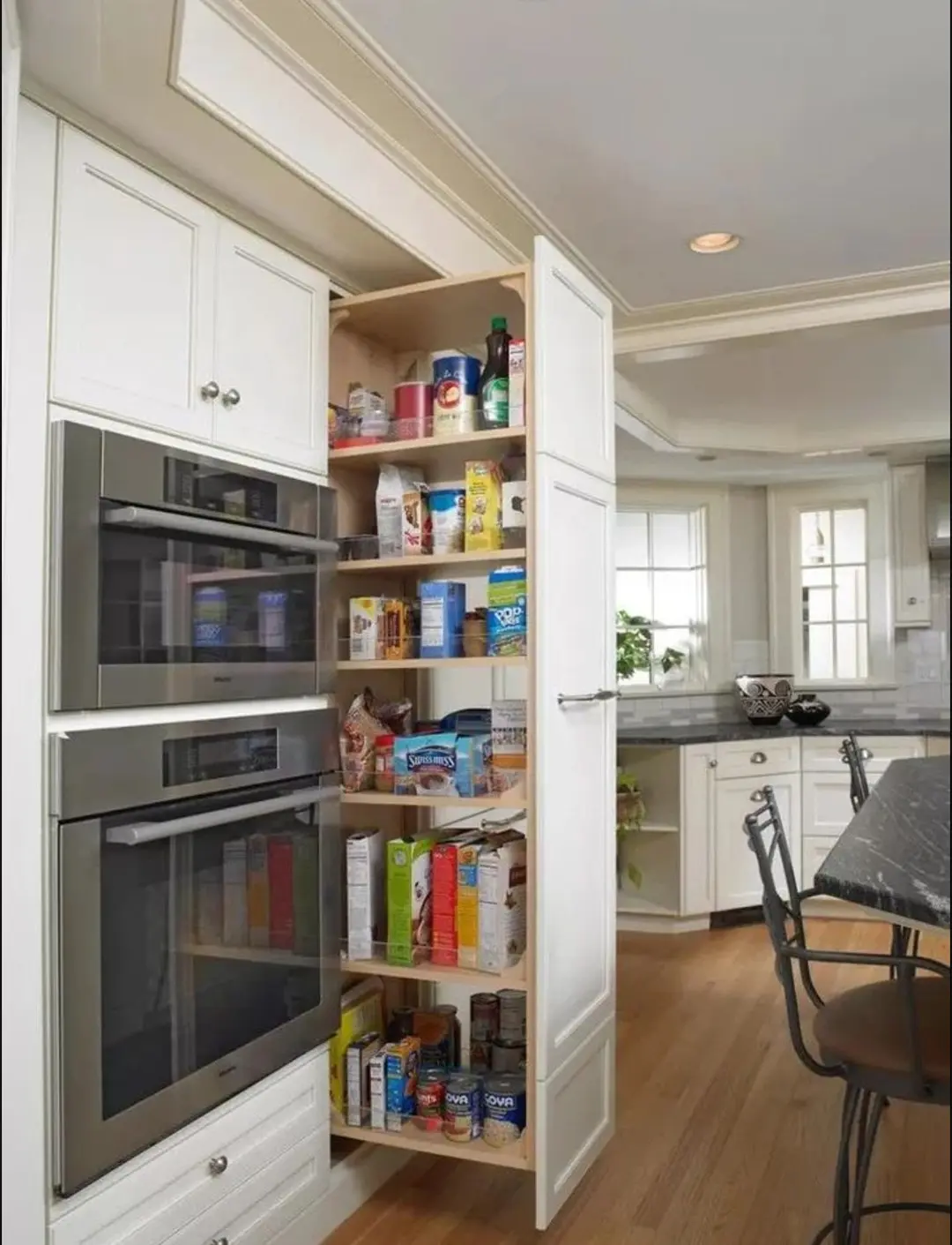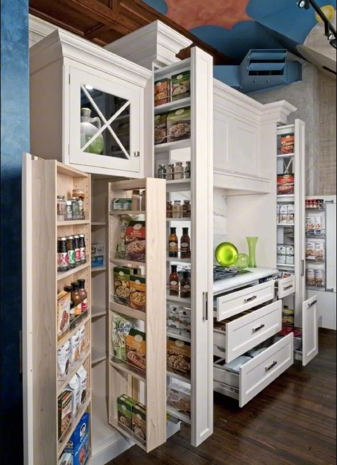 或许是国外烹饪食物的时候,会用到许多配料,所以橱柜里永远都是满满当当的样子,从上到下的超级抽拉式柜,完全可以满足展示架的功能,同时还能起到隐藏功能。分类收纳,拿取方便还能完全展示出物品摆放的位置。