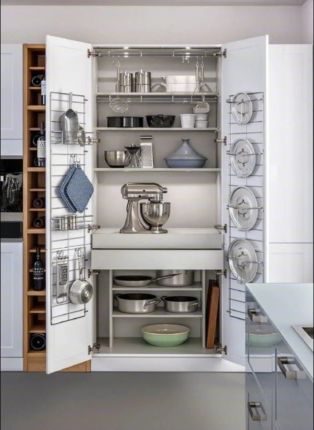 锅盖、盖帘、各种厨房小工具都可以利用柜门进行收纳。甚至还可以专门打造一个到顶的橱柜用来收纳厨房电器和锅具!