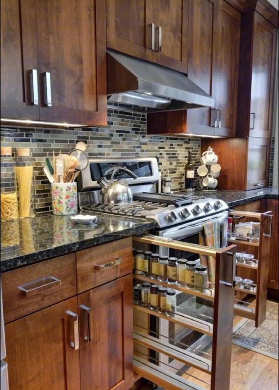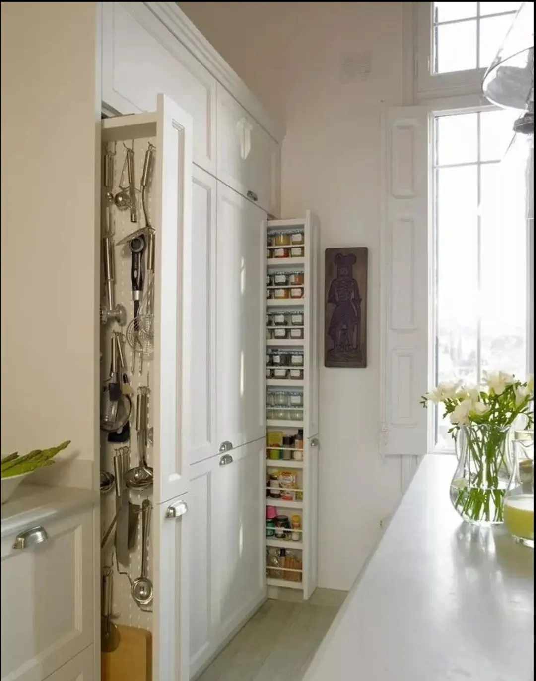 就连灶台两侧都要打造个夹缝抽拉柜,10公分左右的宽度,打造两个调料架,做饭的时候拉开抽拉柜就能拿到需要的调料,简直不要太方便啊!完全避免了台面乱糟糟的情况,而且使用完还能随手就放在架子上,就连整理都变得轻松许多!