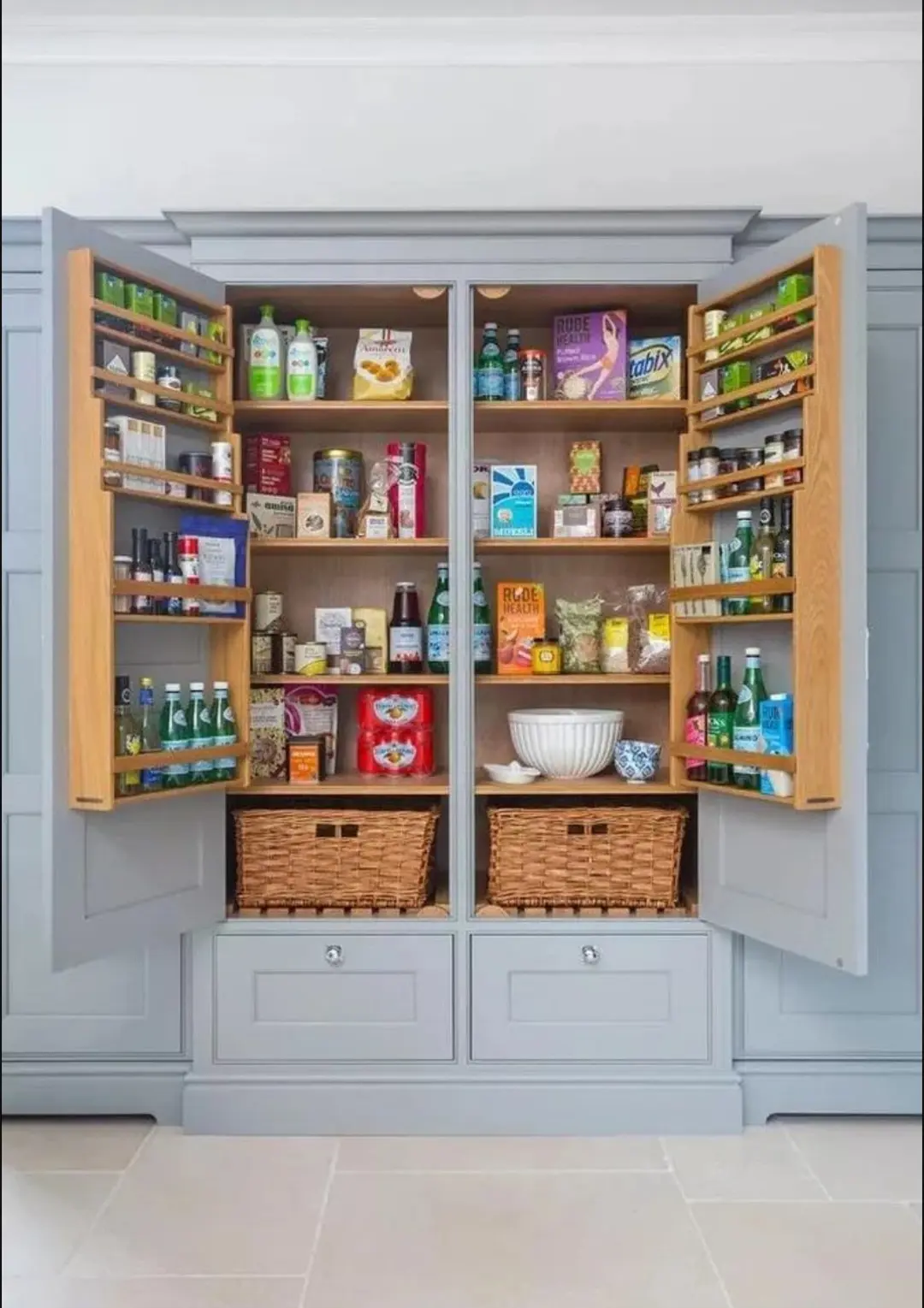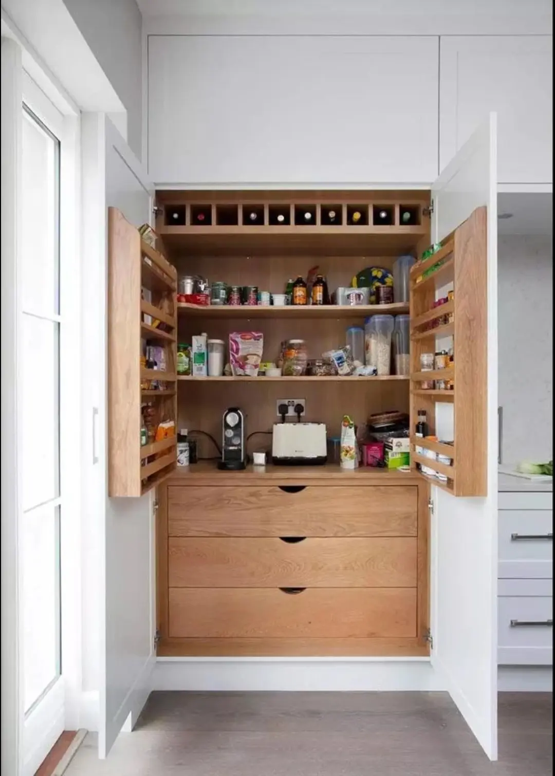 从上图中我们可以看出,这个柜子的占地面积实际上只有2㎡左右,但是收纳空间全部展示出来后,这收纳力比的上一个储物间了!不仅在操作台面的两侧设计了20公分宽的抽拉柜,而且连柜门都设计的像冰箱门一样,不仅有内部储物格,而且还有抽拉式的旋转架,就连柜门都带收纳功能。这个2㎡的橱柜设计,简直太让人惊艳了!