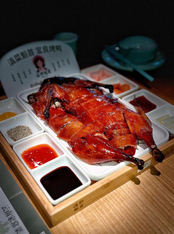 【滇彩魁首宜良烤鸭】店里的招牌,说的“滇彩魁首”就是指它。这道菜起源于明代,距今已有600余年的历史。而今也是云南省非物质文化遗产。